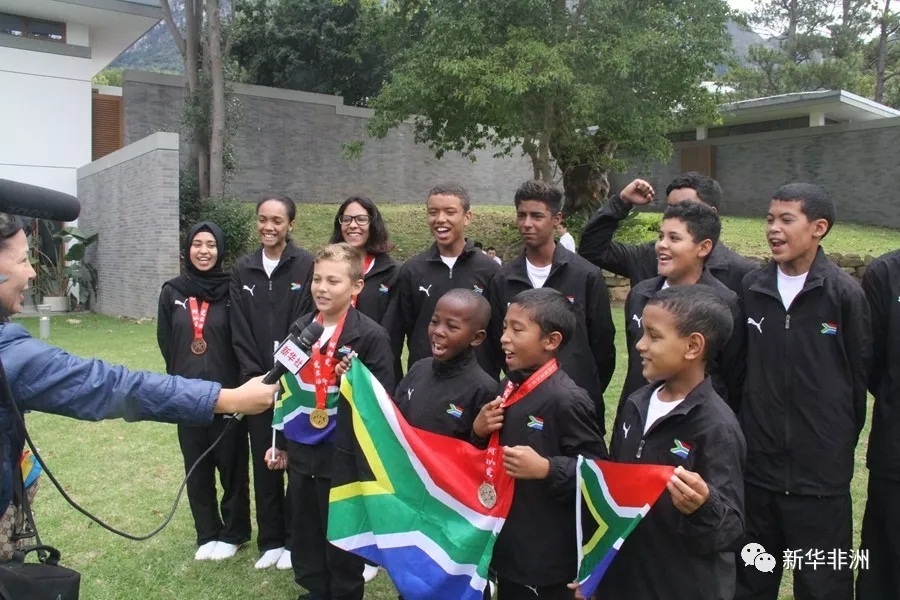 图为中国驻开普敦总领事康勇(中)和查飞葛及弟子合影。(威廉.穆维摄)