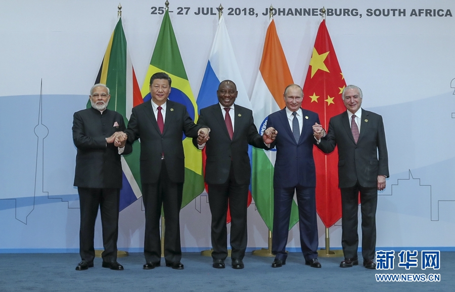 7月26日,金砖国家领导人第十次会晤在南非约翰内斯堡举行。南非总统拉马福萨主持。中国国家主席习近平、巴西总统特梅尔、俄罗斯总统普京、印度总理莫迪出席。这是五国领导人合影。新华社记者 谢环驰 摄