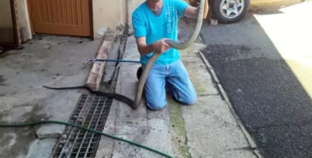 他连忙打电话叫蛇类专家来处理;与此同时,其中一条狗已经扑了上去;随后另外的狗也一拥而上。