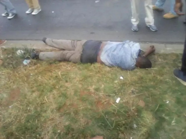 南非百姓对于罪犯的痛恨,得到了猛烈发泄的机会:一名拦路抢劫嫌疑犯,在约堡街头被打的死去活来。