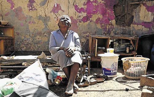 南非东部城市彼得马里兹堡,一位老太太的家被风暴所摧毁,她坐在废墟中仰天长叹。