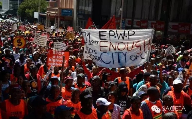 据人民网消息,当地时间7日上午,南非工会联合会(Cosatu)在全国九省范围内掀起大规模游行,以抗议高额税收、高速公路E-toll收费、失业率增加等影响工人群体的主要问题。