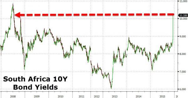 此事距离南非主权信用评级被调降至接近垃圾级之后仅仅一周,这让投资者对南非经济和债务的担忧加剧。南非债券和外汇市场崩盘。十年期国债收益率飙升140个基点,至10.18%,为2008年7月以来的最高水平。主权国债CDS价格暴涨。