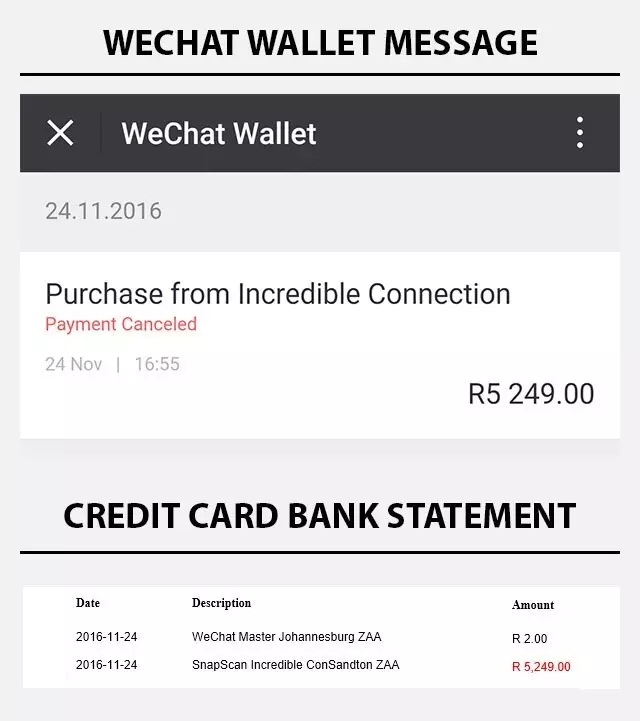 但是,消费者检查银行账户后却发现, 5249兰特已经被从信用卡中扣掉,描述为“SnapScan Incredible ConSandton ZAA”。
