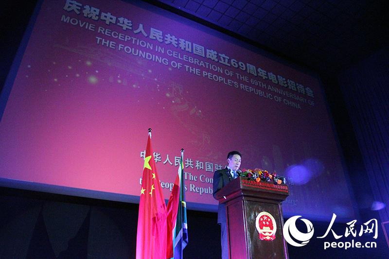 人民网约翰内斯堡9月25日电(王磊)南非当地时间9月24日,中国驻约翰内斯堡总领馆隆重举办庆祝中华人民共和国成立69周年电影招待会。中国驻约翰内斯堡总领事阮平携夫人出席了招待会并致辞,来自南非中资企业和华侨华人代表、当地政府、学界、工商界等近300余人出席活动。