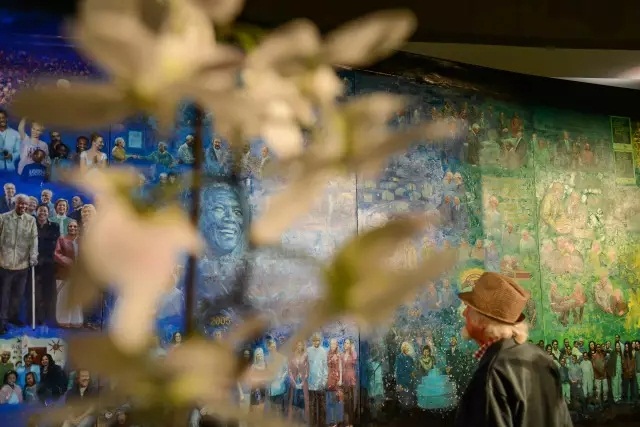 一名老人在约堡大学欣赏中国画家创作的油画《曼德拉》(2015年4月21日摄)。