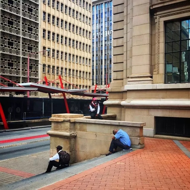 一名男子(右下角)在约堡的一个购物中心外打电话(2015年6月13日摄)。