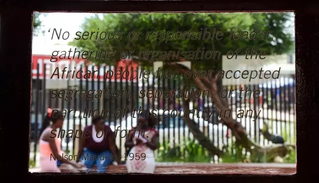 三名女孩在约堡索韦托的曼德拉故居交谈(2014年12月4日摄)。