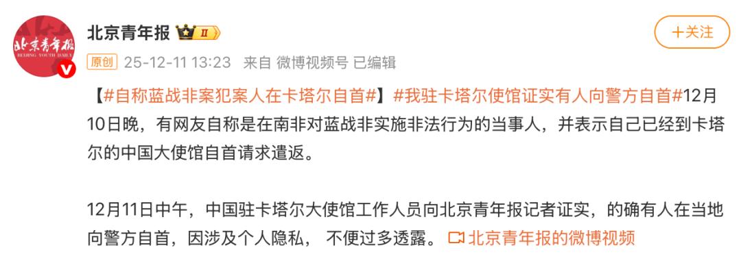 12月10日晚,有网友自称是在南非对蓝战非实施非法行为的当事人,并表示自己已经到卡塔尔的中国大使馆自首请求遣返。12月11日中午,中国驻卡塔尔大使馆工作人员向北京青年报记者证实,的确有人在当地向警方自首,因涉及个人隐私,不便过多透露。