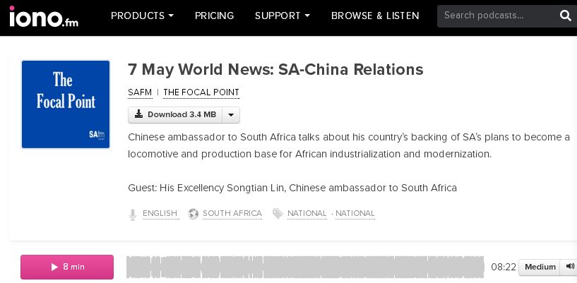 5月6日,中国驻南非大使林松添接受了南非广播公司电台《焦点》栏目现场直播连线采访,就中南关系、中国如何支持南非成为支撑非洲工业化和现代化的生产基地以及中国对南投融资合作等回答了主持人提问。林大使以详实的数据和鲜活的事例,阐述了中国对非政策与实践和中南中非友好互利合作成果,有力驳斥了西方媒体炒作中国对非投资“谋求占有战略资产”等不实论调。