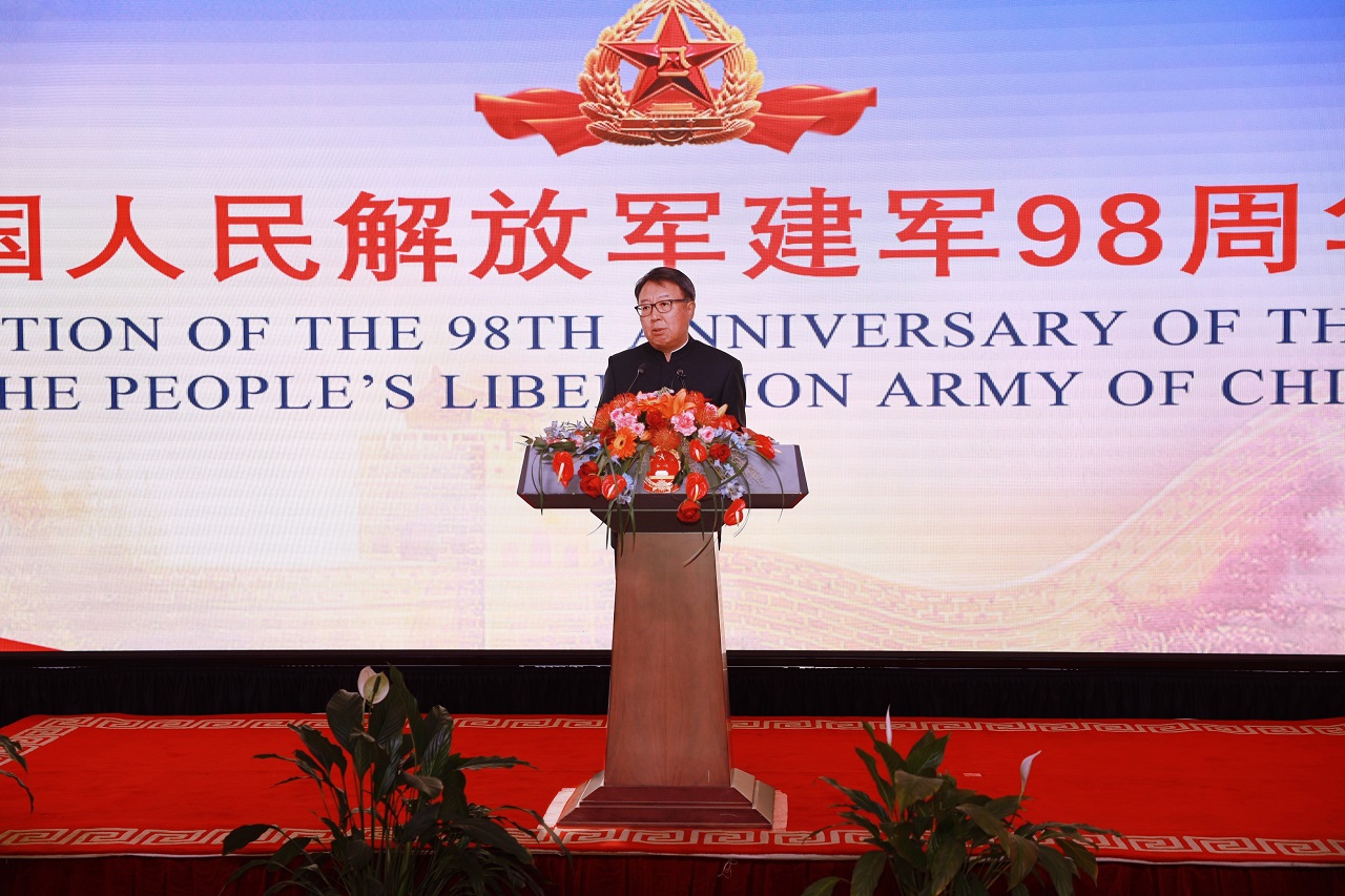 吴鹏大使在致辞中指出,中国人民解放军在中国共产党的领导下,为中国人民的解放事业,为中国的和平建设和改革开放,为捍卫国家主权、安全和发展利益作出卓越贡献。中国始终不渝走和平发展道路,坚定不移奉行防御型国防政策,落实习近平主席提出全球安全倡议,同国际社会一道倡导真正的多边主义,维护国际和公平正义,共建持久和平、普遍安全的世界。