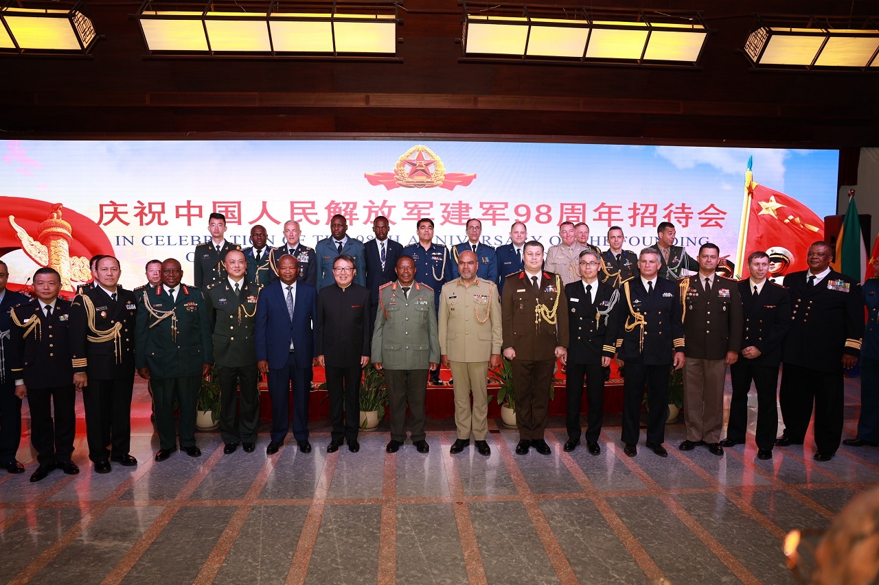 8月1日,中国驻南非使馆举行招待会,热烈庆祝中国人民解放军建军98周年。中国驻南非大使吴鹏、国防武官吴巍少将,南非国防和退伍军人部副部长霍洛米萨,南非国防军司令马普赫万亚上将、国防部总监察长马兹布科少将、陆军副司令赛斯少将、海军副司令马哈拉纳海军少将、后勤部部长姆罗茨少将等军队高层,南非贸工部总司长汉密尔顿、科创部总司长赛莱、总统保卫局副局长阿里、南非国防工业协会执行主席恩德洛武及各国驻南武官、华人华侨留学生和代表等200余人出席。