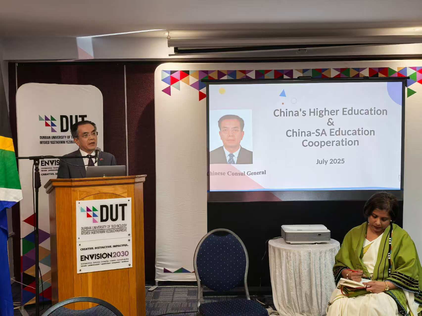 7月28日,驻德班总领事李志工应邀出席德班理工大学“国际周”教育与外交研讨会,并主宾身份致辞并回答与会师生提问。总领事介绍了中国高等教育基本情况和发展成果,重点阐述了中南教育合作的实际成效与广阔前景,鼓励南非青年学生加强对中国的了解,积极参与中南交流与合作,表示驻使领馆愿为此提供支持和协助。研讨会吸引了夸纳省多所高校的教师和学生代表出席,与会人员就教育国际化与人文合作进行深入交流。