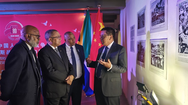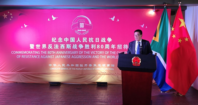 2025年8月15日,驻开普敦总领馆在好望堡举办纪念中国人民抗日战争暨世界反法西斯战争胜利80周年招待会暨图片展。南非国民议会事务主席弗罗里克、西开普省文化与体育厅常务副厅长莱德曼等各界友好人士100余人出席。