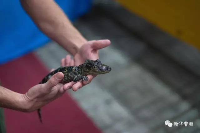 珍稀爬行动物保护组织向参展观众展示人工繁育出的小鳄鱼。