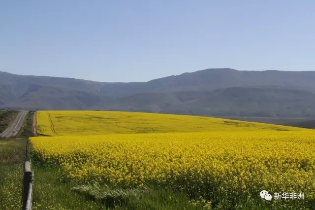 在南非,8月是“春风又绿江南岸”的季节。在立法首都开普敦以东约100公里的卡利登(Caledon)小镇,金黄色的油菜花开得热火朝天,真可谓“满地尽带黄金甲”,景色美不胜收,令人流连忘返。