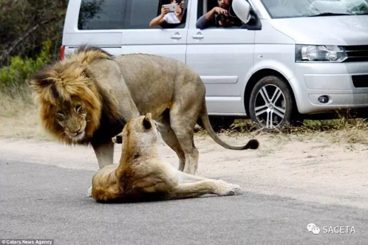 两只狮子因为在南非一个国家公园的马路中间交配,导致交通堵塞。