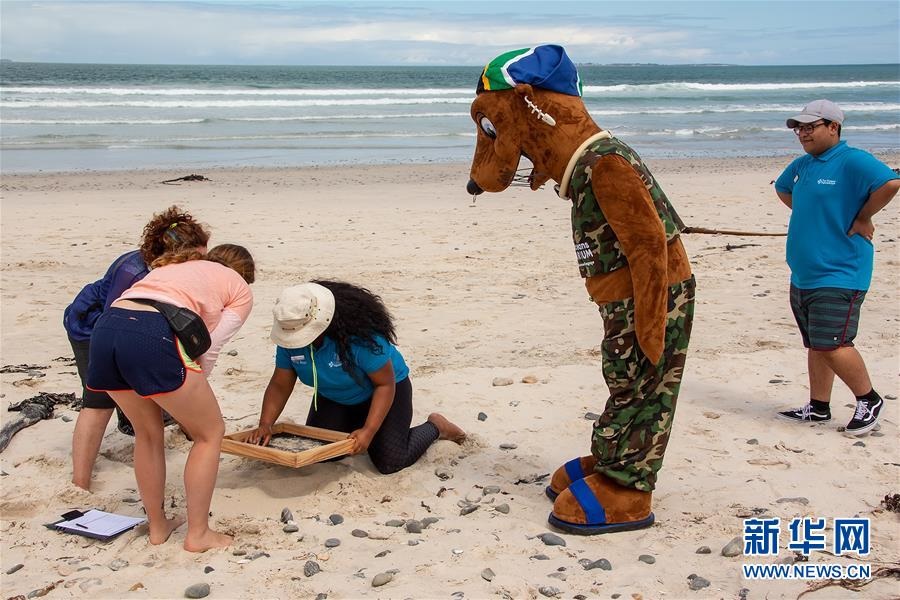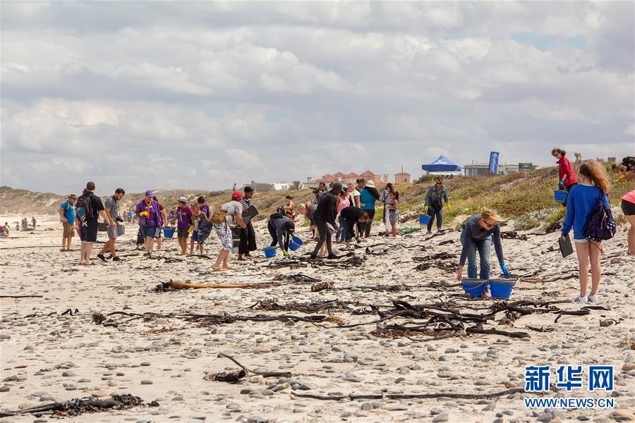 2月8日,在南非开普敦,一名儿童在沙子中筛除塑料颗粒。 当日,南非开普敦举行清理海滩垃圾、保护海洋环境活动,吸引了众多志愿者参加。 新华社发(琳达·易 摄)