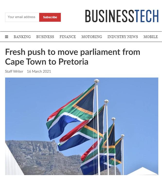 将南非议会从开普敦搬迁到政府所在地-比勒陀利亚的建议从1990年开始就已出现。开普敦和比勒陀利亚相距约1400公里,为了办公需要,南非400名议员和内阁成员在两地都有住房,且政府每年要负担相关人员的多次往返费用。近日南非议会财政管理委员会已经宣布支持相关议员提出的将议会迁往比勒陀利亚的提议。预计该搬迁将花费70亿兰特(折合人民币31亿元),但搬迁后将为该国政府每年节省7亿兰特左右。但如果该动议获得批准,将对开普敦乃至西开普省经济产生巨大负面影响,因此西开普省一直表示强烈反对。