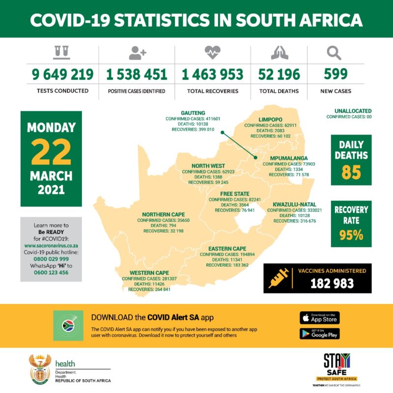 3月22日,南非新冠肺炎新增599例,累计确诊人数1538451例。当日检测新冠肺炎疑似患者13932例,累计检测9649219例。新增死亡85例,累计死亡52196例。全国累计康复病例1463953例,康复率为95%,累计182983人接种新冠疫苗。