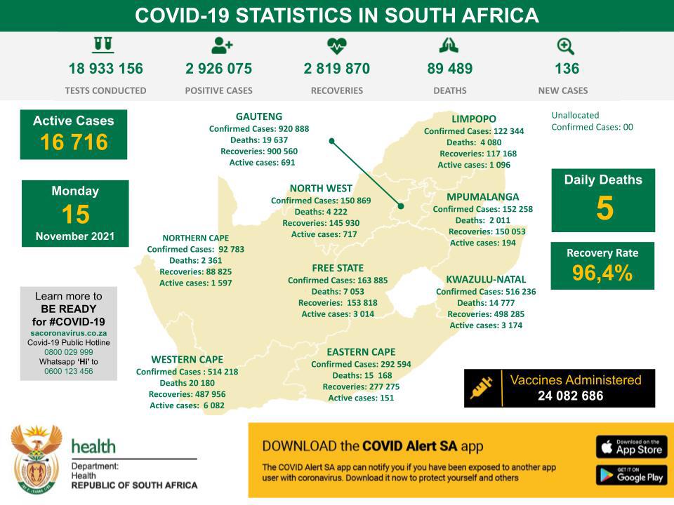 11月15日,南非新冠肺炎新增136例,累计确诊人数2926075例。累计检测18933156例。新增死亡5例,累计死亡89489例。全国累计康复病例2819870例,康复率为96.4%,累计接种24082686剂新冠疫苗。
