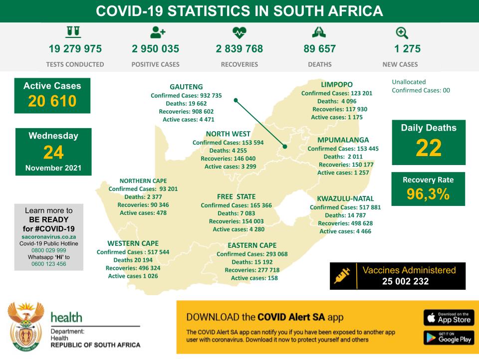 11月24日,南非新冠肺炎新增1275例,累计确诊人数2950035例。累计检测19279975例。新增死亡22例,累计死亡89657例。全国累计康复病例2839768例,康复率为96.3%,累计接种25002232剂新冠疫苗。