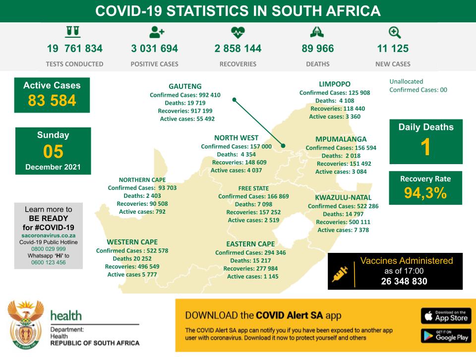 12月5日,南非新冠肺炎新增11125例,累计确诊人数3031694例。累计检测19761834例。新增死亡1例,累计死亡89966例。全国累计康复病例2858144例,康复率为94.3%,累计接种26348830剂新冠疫苗。