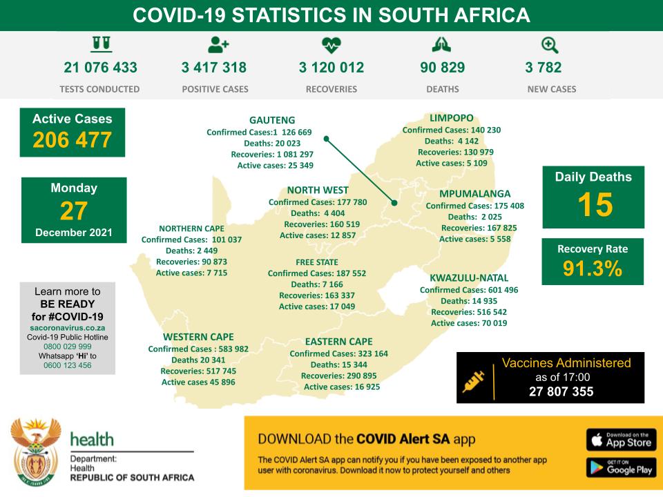 12月27日,南非新冠肺炎新增3782例,累计确诊人数3417318例。新增死亡15例,累计死亡90829例。现有活跃病例206477例,累计康复病例3120012例,康复率为91.3%,累计接种疫苗总数为27807355。