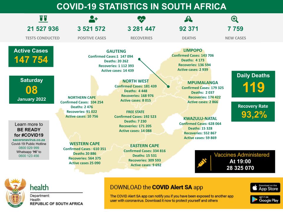 1月8日,南非新冠肺炎新增7759例,累计确诊人数3521572例。新增死亡119例,累计死亡92371例。现有活跃病例147754例,累计康复病例3281447例,康复率为93.2%,累计接种疫苗总数为28325070。
