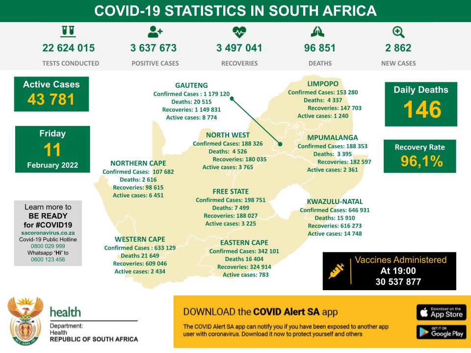 2月11日,南非新冠肺炎新增2862例,累计确诊人数3637673例。新增死亡146例,累计死亡96851例。现有活跃病例43781例,累计康复病例3497041例,康复率为96.1%,累计接种疫苗总数为30537877。