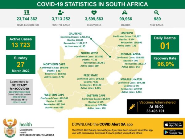 3月27日,南非新冠肺炎新增989例,累计确诊人数3713252例。新增死亡1例,累计死亡99966例。现有活跃病例13723例,康复率为96.9%,累计接种疫苗总数为33405701。
