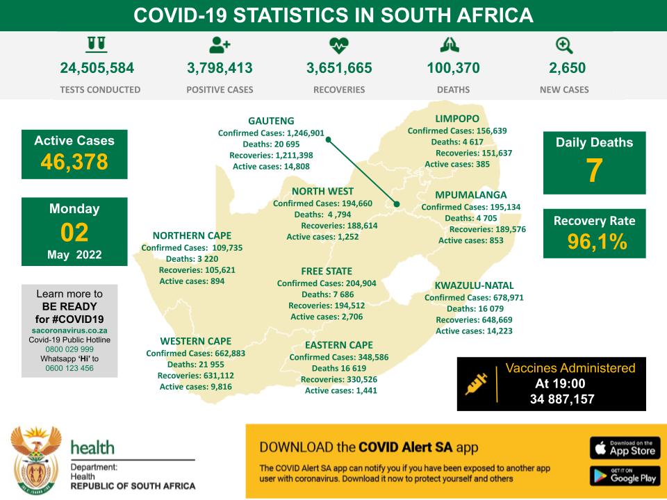 5月2日,南非新冠肺炎新增2650例,累计确诊人数3798413例。新增死亡7例,累计死亡100370例。现有活跃病例46378例,康复率为96.1%,累计接种疫苗总数为34887157。