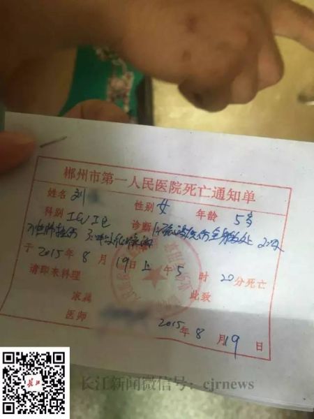 郴州女童小欣的死亡通知单。 图/死者家属提供8月17日,湖南省郴州市永兴县油麻乡8岁男孩小铭和其5岁的妹妹小欣被两个老人强灌浓硫酸,导致一死一伤。