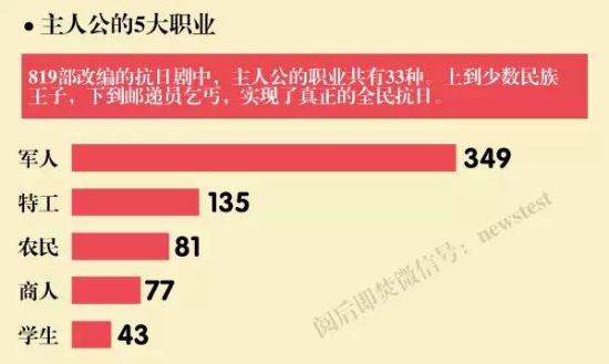 在主人公的第一份职业设定上,几乎无所不包。下有街头乞丐抗日,上有少数民族王子打鬼子,实现了真正的“抗日民族统一战线”。有5种职业是抗日(剧)的主要选择。