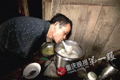 电饭锅里已煮好稀饭,陈星银用嘴舀到碗里。