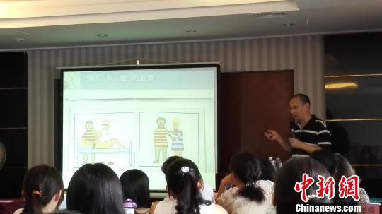 北京林业大学性与性别研究所所长方刚23日在山西太原对50位家长和学校心理老师进行了性教育培训。他说,中国家庭性教育能力普遍欠缺。图为方刚讲解德国的性教育绘本。 李娜 摄中新网太原8月23日电 (李娜)“孩子问到性内容,尽量含蓄带过;电视中出现男女亲密镜头,立即调台;不让孩子看到异性父母的裸体。你们做过这些事吗?”“都做过。”一阵哄笑声后,家长们纷纷回答。北京林业大学性与性别研究所所长方刚23日在山西太原对50位家长和学校心理老师进行了性教育培训。