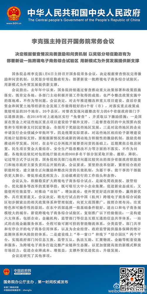 1月6日,国务院总理李克强主持召开国务院常务会议,决定根据督查情况完善激励和问责机制,以奖惩分明促勤政有为;部署新设一批跨境电子商务综合试验区,用新模式为外贸发展提供新支撑。