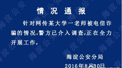 记者刚刚从警方获悉 清华教师被电信诈骗属实,警方已介入调查。海淀警方同时提醒市民,不听,不信,不转账,增强自我防范意识。