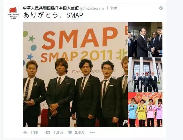 26日晚,即将正式解散的日本国民偶像组合SMAP的王牌节目《SMAPxSMAP》播出了最后一期。节目播出后第一时间,中国驻日本大使馆官方账号发布了一条推特:“谢谢你们,SMAP。”并附上了2011年SMAP来中国举行演唱会时的照片。