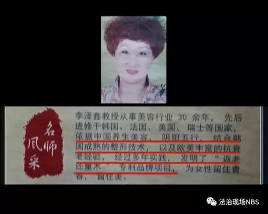 这份宣传广告上写着,李泽鑫的教授依据中国养生美容、阴阳五行,结合韩国成熟的整形技术以及欧美丰富的抗衰老经验,经过多年实验发明了“返老还童术”专利品牌项目,声称不开刀不注射不吃药,3天年轻5-20岁。