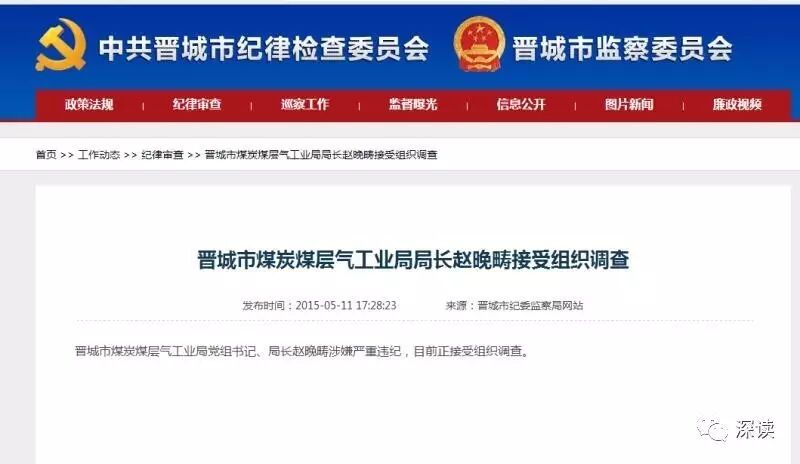 2015年5月11日,山西省纪委监察厅网站发布信息,晋城市煤炭煤层气工业局党组书记、局长赵晚畴涉嫌严重违纪,目前正接受组织调查。