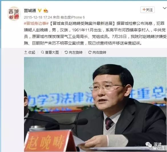 2015年7月31日,晋城检察院发布消息,晋城市煤炭煤层气工业局党组书记、局长赵晚畴因涉嫌受贿、巨额财产来源不明罪被晋城市人民检察院立案侦查。