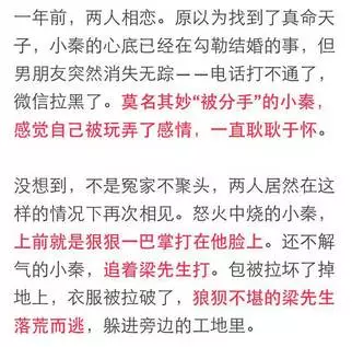 “你来的这么早!”美女转过身时,梁先生呆掉了——站在眼前的,居然是前女友小秦。看到梁先生,小秦也呆掉了。
