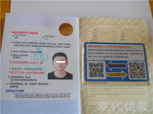 现代快报讯(通讯员 张林 明宝 记者 韩秋)25日下午,扬州高邮警方通报一起涉及“国际驾驶证”的案件。28岁的高邮市临泽镇男子胡强(化名),因醉驾被吊销驾驶证后,再次伪造驾驶证,这次“玩大了”,竟伪造了“国际驾驶证”。5月23日,胡强涉嫌醉酒驾驶发生单方面交通事故被查时,向民警出示了这本上面全是外文的驾驶证,并对民警称,这本“国际驾驶证”是真的,全国通用!?