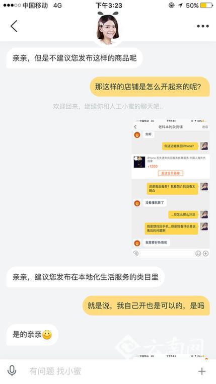 当日下午,淘宝人工在线客服表示,不建议卖家发布 “手机丢失老外代报案”的商品信息。但当云南网提出这样的店铺已经存在是否合规时,客服又称,可以开这样的店铺,建议把商品发布在本地化生活服务类目里,待店铺审核通过开启后,而这样的商品也不需要备案,卖家直接发布即可。同时,客服还说,若是商家在商品信息中说明过此商品无法退款,那么手机找不回也无法退款,不过若是买家有商品凭证,也可要求淘宝小二介入。