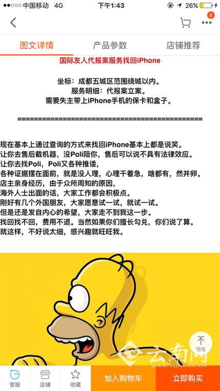 6月18日,云南网记者无意中在淘宝中输入“iphone丢失找回服务”时,检索出现很多条找回服务信息。其中一则写着外国人海外代报案的商品信息引起了云南网记者的关注,商品介绍称“国际友人代报案服务找回iPhone”,价格为1200元,坐标为成都五城区范围绕城以内,服务明细还备注,代报案立案,需要失主带上iPhone手机的保卡和盒子。但在店铺简介资料页中显示,该店铺填写的所在地是在北京,开店时间是2014年4月24日。