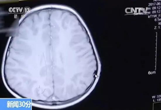 从雯雯送医检查时拍摄的照片可以看到,金属飞镖其中的一个角,牢牢地插入了雯雯左侧的头颅。通过CT扫描检查发现,飞镖一角已经穿透头皮2厘米。
