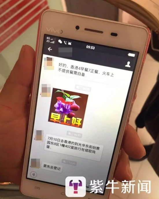 不过就在紫牛新闻记者采访时,遇到从这家旅社出来的鲁女士,她正是同一批次港澳游旅行团的游客之一,来到这里也是为了讨个说法的。“我当时就是在这里的402A室交的钱,回到南京后很多同行的人准备投诉这家公司,公司提出给每人10个鸡蛋的补偿,但并不能让人满意。”鲁女士告诉记者,她并不清楚两家旅社的关系,但是报名时有工作人员帮她用手机关注了“健享生命”的公众号,并加入了一系列好友群。“真是受罪啊!”,回忆起此次港澳游经历,鲁女士这样形容,她们的导游曾一度在车上推销商品,不购买大巴就不开车。