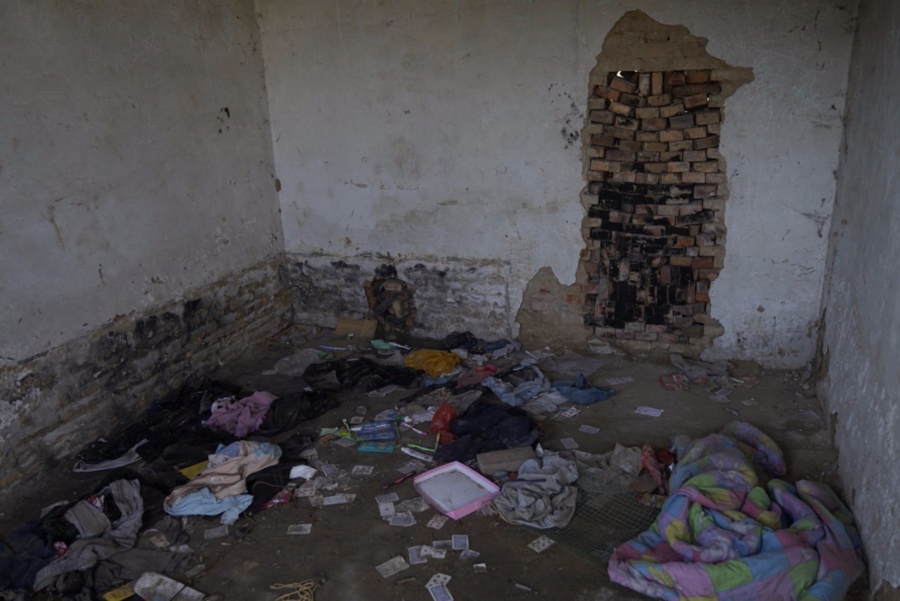 8月4日下午,大口子门村西北角靠近国道处,靠近水坑的一间红顶小屋,无门,玻璃窗碎裂。屋内水泥墙上写有“成王败寇”等字样,燃烧后的蚊香和扑克牌散落在地上。小屋旁干涸的水沟里,遗弃着几床被子。村民指认,这里曾是传销人员上课的地点。