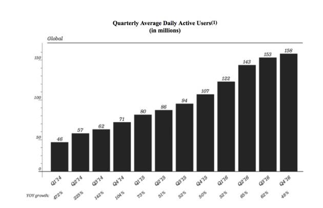 去年第四季度,公司拥有1.58亿日均活跃用户,同比增长48%。去年公司营收4.056亿美元,亏损5.146亿美元,2015年营收5770万美元,亏损3.729亿美元。